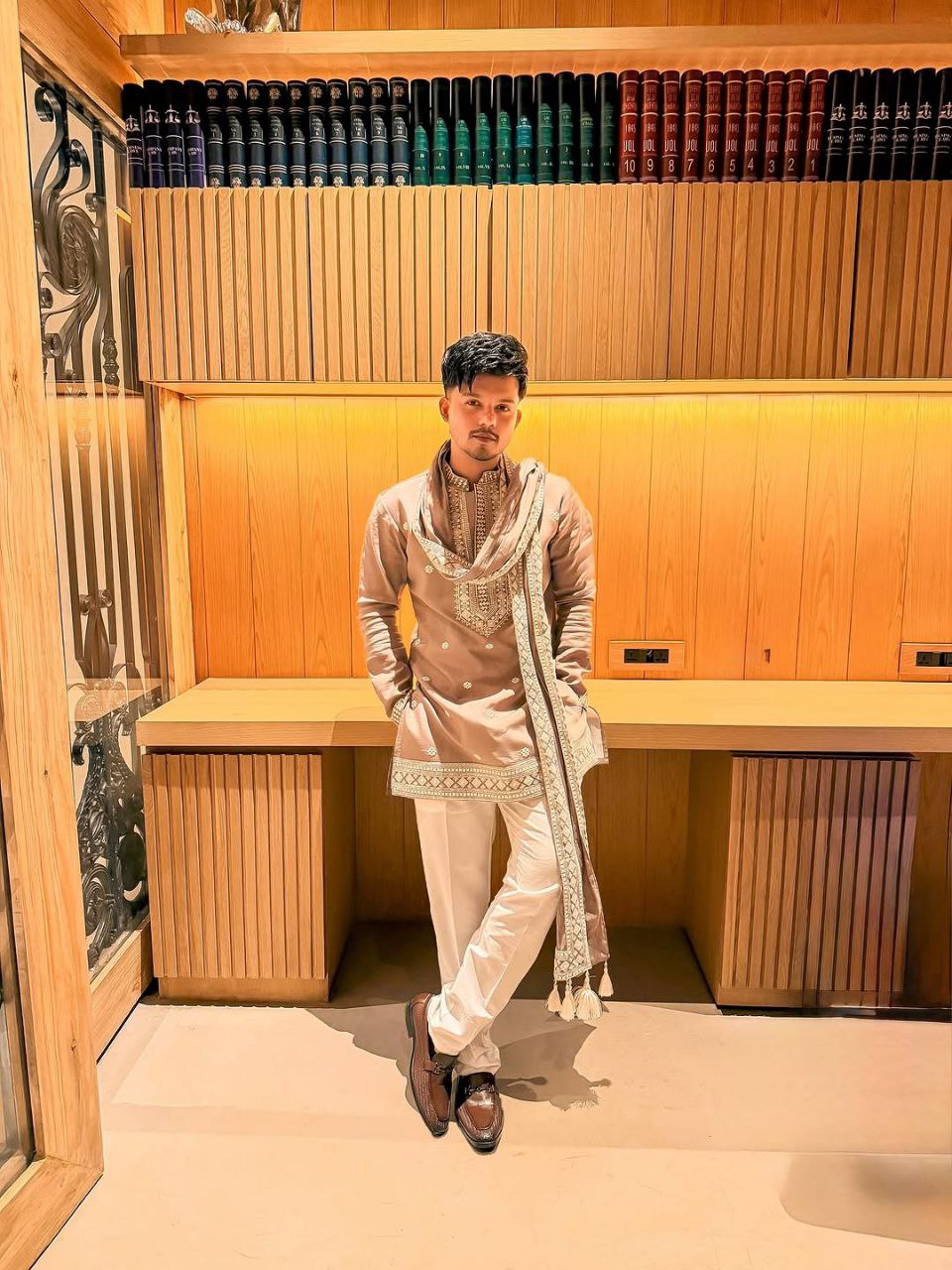 Riyaz Beige Embroidered Kurta Pyjama with Stole
